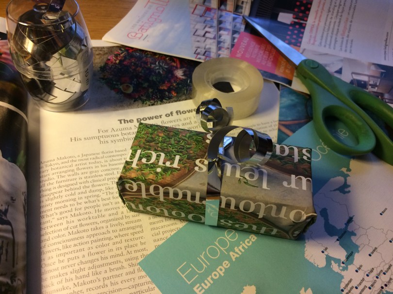 This year, as I set out to wrap some Christmas gifts, I looked through my magazine piles and selected some free publications that I wasn’t going to look at again. These included an old Air France magazine, a Palais des Thés tea catalogue, a free cinema magazine from a local theater, and the summer edition of my district’s magazine (yes, in Paris each of the 20 arrondissements has its own free magazine to keep residents in the know—nice, huh?). Other things that can be upcycled into gift wrapping are brochures from art exhibitions, newspaper pages, comics and even old maps. Anything with interesting colors and visuals can work as long as the paper is thick enough.