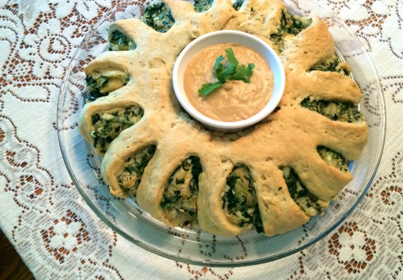 When the ring is done baking and the cheese sauce is ready, place a ramekin or small bowl in the center of the ring and fill with sauce. To serve, place a spoonful of sauce on each plate and top with a slice of the spinach-artichoke ring.